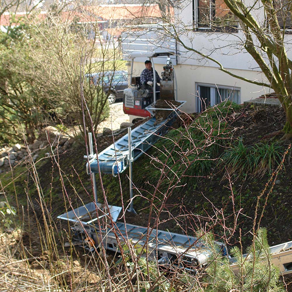 Individuelle Geländeanpassung mit Bandlängen von 3m, 4m und 6m. Förderlängen bis ca. 19 m und Förderhöhen bis ca. 12 m mit Kopplung von Bändern möglich.