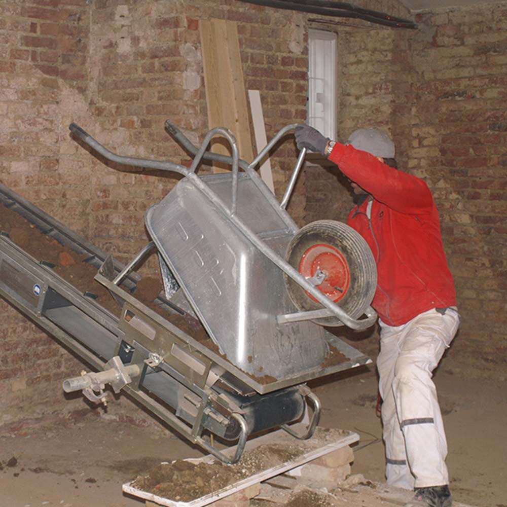 Bei allen Renovierungs- und Baumaßnahmen, bei denen viel Schutt anfällt, spart die Nutzung von Förderbändern erheblich Zeit, Kraft und Geld. Dank Förderbändern können schwere und unhandliche Stoffe, wie Schutt und Bauabfälle, problemlos direkt von der Baustelle z.B. in den bereitstehenden Container befördert werden.